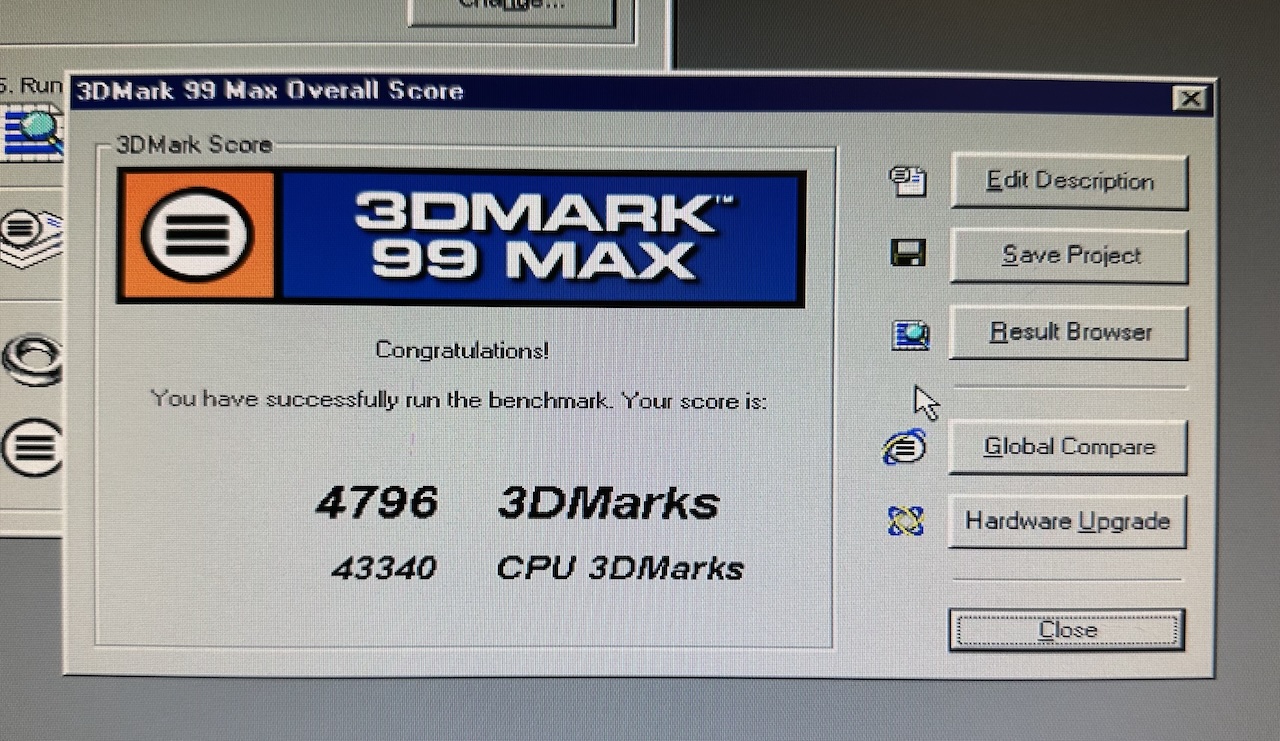 One of the screenshots in the notes shows a 3DMark 99 Max score of 4796 with the Voodoo 2 installed, which is a good sign that the hybrid approach is more than just theoretically workable.