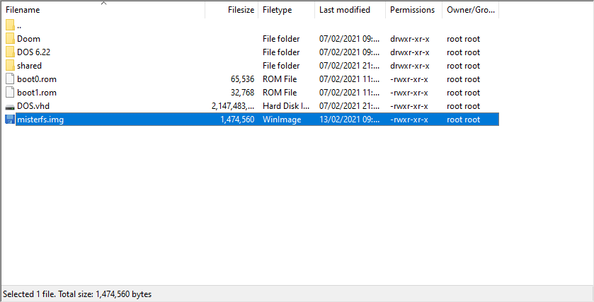 /media/fat/games/AO486on your MiSTer (reminder on how to do that here). You should have a single file namemisterfs.img: